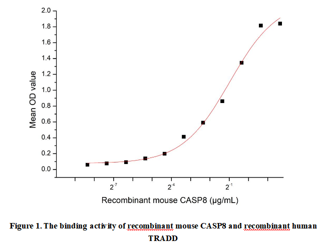 Caspase 8 (CASP8) is a key initiator protease in the extrinsic apoptosis pathway. Upon activation by death receptors—such as Fas or TNFR1—it is recruited to death-inducing signaling complexes (DISCs). Via its N-terminal death effector domains (DEDs), CASP8 forms oligomers and undergoes autocleavage to achieve full enzymatic activity; it then cleaves downstream effector caspases to execute the apoptotic program. Beyond apoptosis, CASP8 also plays a role in regulating necroptosis, inflammatory responses, and cell differentiation processes. Mechanistically, CASP8 interacts with TNFRSF1A Associated Via Death Domain Protein (TRADD) through homotypic death domain (DD)-mediated binding, a process that facilitates the transduction of apoptotic signals.To detect the activity of recombinant CASP8, a functional ELISA assay was performed to evaluate the interaction between recombinant mouse CASP8 and recombinant human TRADD.Briefly, biotin-linked CASP8 were diluted serially in PBS, with 0.01% BSA (pH 7.4). Duplicate samples of 100µl were then transferred to TRADD-coated microtiter wells and incubated for 1h at 37℃. Wells were washed with PBST 3 times and incubation with Streptavidin-HRP for 30min, then wells were aspirated and washed 5 times. With the addition of substrate solution, wells were incubated 15-25 minutes at 37℃. Finally, add 50µl stop solution to the wells and read at 450nm immediately. The binding activity of CASP8 and TRADD was shown in Figure 1, the EC50 for this effect is 0.51 µg/mL.