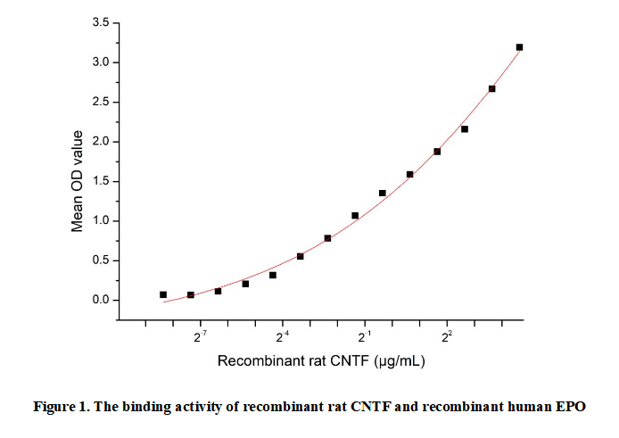 Ciliary Neurotrophic Factor (CNTF) is a 22 kDa cytokine initially identified for its role in supporting parasympathetic neuron survival. It signals through a tripartite receptor complex to activate JAK-STAT pathways, particularly STAT3. Primarily expressed in Schwann cells and astrocytes, CNTF promotes neuronal survival, differentiation, and regeneration in both CNS and PNS. It demonstrates neuroprotective effects in models of ALS, Huntington's disease, and retinal degeneration. Unlike classical cytokines, CNTF lacks a signal peptide and is released after cellular injury. Current research explores its therapeutic potential for neurodegenerative disorders and metabolic regulation.Besides,Erythropoietin (EPO) has been identified as an interactor of CNTF, thus a functional binding ELISA assay was conducted to detect the interaction of recombinant rat CNTF and recombinant human EPO. Briefly, CNTF was diluted serially in PBS with 0.01% BSA (pH 7.4). Duplicate samples of 100 μl were then transferred to EPO-coated microtiter wells and incubated for 1h at 37℃. Wells were washed with PBST and incubated for 1h with anti-CNTF pAb, then aspirated and washed 3 times. After incubation with HRP labelled secondary antibody for 1h at 37℃, wells were aspirated and washed 5 times. With the addition of substrate solution, wells were incubated 15-25 minutes at 37℃. Finally, add 50 µL stop solution to the wells and read at 450/630nm immediately. The binding activity of recombinant rat CNTF and recombinant human EPO was shown in Figure 1, and this effect was in a dose dependent manner.