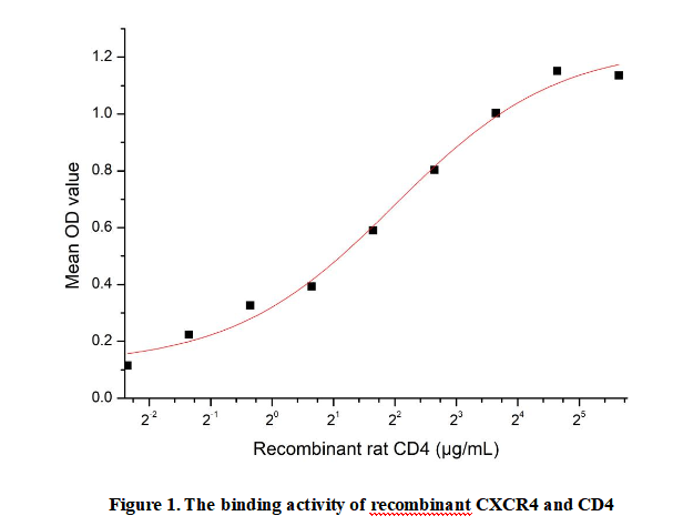 Cluster of Differentiation 4 (CD4) is a transmembrane glycoprotein expressed primarily on helper T cells, regulatory T cells, and dendritic cells. As a key immune checkpoint molecule, it interacts with MHC class II molecules to modulate T cell activation, proliferation, and cytokine secretion, playing pivotal roles in adaptive immunity, inflammation, and immune homeostasis. CD4 binds to CXCR4, a G protein-coupled chemokine receptor, facilitating cell migration and signaling crosstalk in immune responses and tissue homeostasis.Briefly, CXCR4 was diluted serially in PBS with 0.01% BSA (pH 7.4). Duplicate samples of 100 μl were then transferred to CD4-coated microtiter wells and incubated for 1h at 37℃. Wells were washed with PBST and incubated for 1h with anti-CXCR4 pAb, then aspirated and washed 3 times. After incubation with HRP labelled secondary antibody for 1h at 37℃, wells were aspirated and washed 5 times. With the addition of substrate solution, wells were incubated 15-25 minutes at 37℃. Finally, add 50 µL stop solution to the wells and read at 450/630nm immediately.Measured by its binding ability in a functional ELISA. When Recombinant CD4 is lmmobilized at 2 µg/mL(100 uLwell), the concentration of CXCR4 that produces 50% optimal bindingresponse is found to be approximately 3.97 µg/mL.