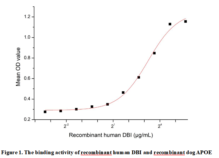 Diazepam Binding Inhibitor (DBI), also known as acyl-CoA-binding protein (ACBP), is a 10 kDa multifunctional protein widely expressed in the brain, liver, and steroidogenic tissues. It's implicated in anxiety regulation, energy homeostasis, and neurodegenerative processes. DBI overexpression has been observed in Alzheimer's disease (AD) brains, suggesting its involvement in neuropathology. DBI interacts with Apolipoprotein E (APOE) by modulating lipid metabolism in astrocytes, potentially influencing APOE-mediated cholesterol transport in AD progression.DBI-APOE interaction alters astrocytic lipid metabolism, impacting neurodegenerative processes.Thus a functional ELISA assay was conducted to detect the interaction of recombinant human DBI and recombinant dog APOE. Briefly, DBI was diluted serially in PBS with 0.01% BSA (pH 7.4). Duplicate samples of 100 μl were then transferred to APOE-coated microtiter wells and incubated for 1h at 37℃. Wells were washed with PBST and incubated for 1h with anti-DBI pAb, then aspirated and washed 3 times. After incubation with HRP labelled secondary antibody for 1h at 37℃, wells were aspirated and washed 5 times. With the addition of substrate solution, wells were incubated 15-25 minutes at 37℃. Finally, add 50 µL stop solution to the wells and read at 450/630nm immediately. The binding activity of recombinant human DBI and recombinant dog APOE was shown in Figure 1, the EC50 for this effect is 9.47 µg/mL.