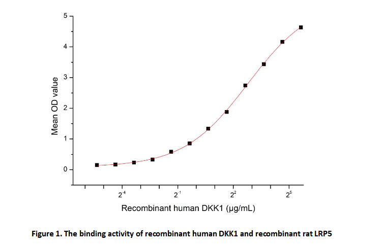 Dickkopf Related Protein 1 (DKK1) is a secreted glycoprotein that functions as a key antagonist of the canonical Wnt/β-catenin signaling pathway. It is critically involved in embryonic development, particularly in head formation, and also plays roles in bone remodeling, cancer progression, and immune regulation. Elevated levels of DKK1 are associated with various bone diseases, including osteoporosis, and certain cancers where it suppresses Wnt-mediated cell differentiation and proliferation. DKK1 inhibits Wnt signaling by directly binding to the Wnt co-receptor Low-Density Lipoprotein Receptor-Related Protein 5 (LRP5), thereby preventing the formation of the Wnt-Frizzled-LRP5 complex and subsequent signal transduction.To detect the activity of recombinant DKK1 , a functional ELISA assay was performed to evaluate the interaction between recombinant human DKK1 and recombinant rat LRP5.Briefly, DKK1 were diluted serially in PBS, with 0.01% BSA (pH 7.4). Duplicate samples of 100ul were then transferred to LRP5-coated microtiter wells and incubated for 2h at 37℃. Wells were washed with PBST and incubated for 1h with anti-DKK1 pAb, then aspirated and washed 3 times. After incubation with HRP labelled secondary antibody, wells were aspirated and washed 3 times. With the addition of substrate solution , wells were incubated 15-25 minutes at 37℃. Finally, add 50µL stop solution to the wells and read at 450nm immediately. The binding activity of DKK1 and LRP5 was shown in Figure 1, and this effect was in a dose dependent manner.
