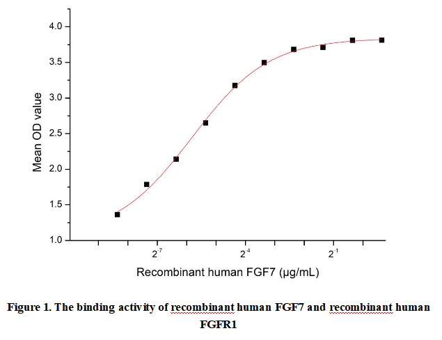 Fibroblast Growth Factor 7 (FGF7), also known as Keratinocyte Growth Factor (KGF), is a paracrine signaling protein that belongs to the FGF family. It primarily targets epithelial cells and plays crucial roles in wound healing, tissue repair, and embryonic development. FGF7 binds specifically to the FGFR2b receptor isoform, activating downstream signaling pathways that promote cell proliferation, migration, and differentiation. This growth factor is particularly important in skin homeostasis and regeneration, as it stimulates keratinocyte proliferation. FGF7 is produced mainly by mesenchymal cells and acts on neighboring epithelial tissues, making it a key mediator in epithelial-mesenchymal interactions. Its therapeutic potential has been explored in conditions like skin ulcers, pulmonary fibrosis, and mucosal injuries.Besides,Fibroblast Growth Factor Receptor 1 (FGFR1)has been identified as an interactor of FGF7, thus a functional binding ELISA assay was conducted to detect the interaction of recombinant human FGF7 and recombinant human FGFR1. Briefly, FGF7 was diluted serially in PBS with 0.01% BSA (pH 7.4). Duplicate samples of 100 μl were then transferred to FGFR1-coated microtiter wells and incubated for 1h at 37℃. Wells were washed with PBST and incubated for 1h with anti-FGF7 pAb, then aspirated and washed 3 times. After incubation with HRP labelled secondary antibody for 1h at 37℃, wells were aspirated and washed 5 times. With the addition of substrate solution, wells were incubated 15-25 minutes at 37℃. Finally, add 50 µL stop solution to the wells and read at 450/630nm immediately. The binding activity of recombinant human FGF7 and recombinant human FGFR1 was shown in Figure 1, the EC50 for this effect is 0.018 µg/mL.