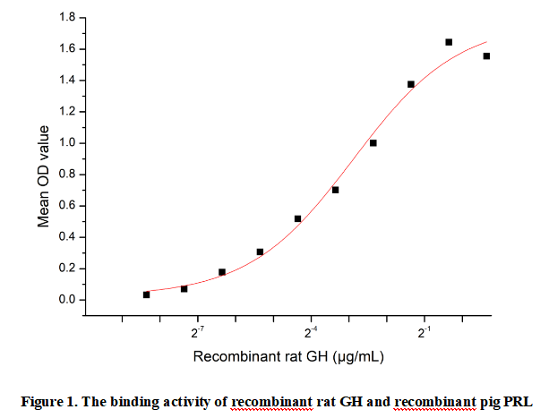Growth Hormone (GH), also known as somatotropin, is a peptide hormone synthesized and secreted by the somatotroph cells of the anterior pituitary gland. It plays a pivotal role in growth regulation, metabolism, and cellular repair across multiple tissues. GH exerts its effects both directly and indirectly through the stimulation of insulin-like growth factor 1 (IGF-1) production in the liver. The hormone binds to the growth hormone receptor (GHR), a member of the cytokine receptor superfamily, activating the JAK2-STAT signaling pathway to regulate gene expression. GH secretion is pulsatile, primarily controlled by hypothalamic growth hormone-releasing hormone (GHRH) and somatostatin. Beyond its growth-promoting functions, GH influences lipid metabolism, glucose homeostasis, and immune function.Besides,Prolactin (PRL) has been identified as an interactor of GH, thus a functional binding ELISA assay was conducted to detect the interaction of recombinant rat GH and recombinant pig PRL. Briefly, GH was diluted serially in PBS with 0.01% BSA (pH 7.4). Duplicate samples of 100 μl were then transferred to PRL-coated microtiter wells and incubated for 1h at 37℃. Wells were washed with PBST and incubated for 1h with anti-GH pAb, then aspirated and washed 3 times. After incubation with HRP labelled secondary antibody for 1h at 37℃, wells were aspirated and washed 5 times. With the addition of substrate solution, wells were incubated 15-25 minutes at 37℃. Finally, add 50 µL stop solution to the wells and read at 450/630nm immediately. The binding activity of recombinant rat GH and recombinant pig PRL was shown in Figure 1, the EC50 for this effect is 0.135 µg/mL.