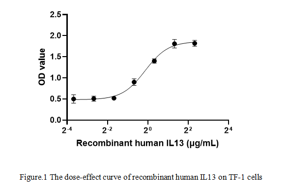 Interleukin 13 (IL13) is cytokine secreted by many cell types, but especially T helper type 2 (Th2) cells. IL13 has effects on immune cells that are similar to those of the closely related cytokine IL4. In addition, IL-13-bound IL-13 Rα2 can directly promote tumor cell proliferation、invasiveness and the development of tissue fibrosis. To test the effect of IL13 on cell proliferation, TF-1 cells were seeded into triplicate wells of 96-well plates and allowed to attach, replaced with various concentrations of recombinant human IL13. After incubated for 72h, cells were observed by inverted microscope and cell proliferation was measured by Cell Counting Kit-8 (CCK-8). Briefly, 10 µl of CCK-8 solution was added to each well of the plate, then the absorbance at 450 nm was measured using a microplate reader after incubating the plate for 1-4 hours at 37 ℃. Cell viability was assessed by CCK-8 assay after incubation with recombinant human IL13 for 72h. The result was shown in Figure 1. It was obvious that IL13 significantly increased cell viability of TF-1 cells. The ED50 of recombinant human IL13 is 0.914 μg/ml.