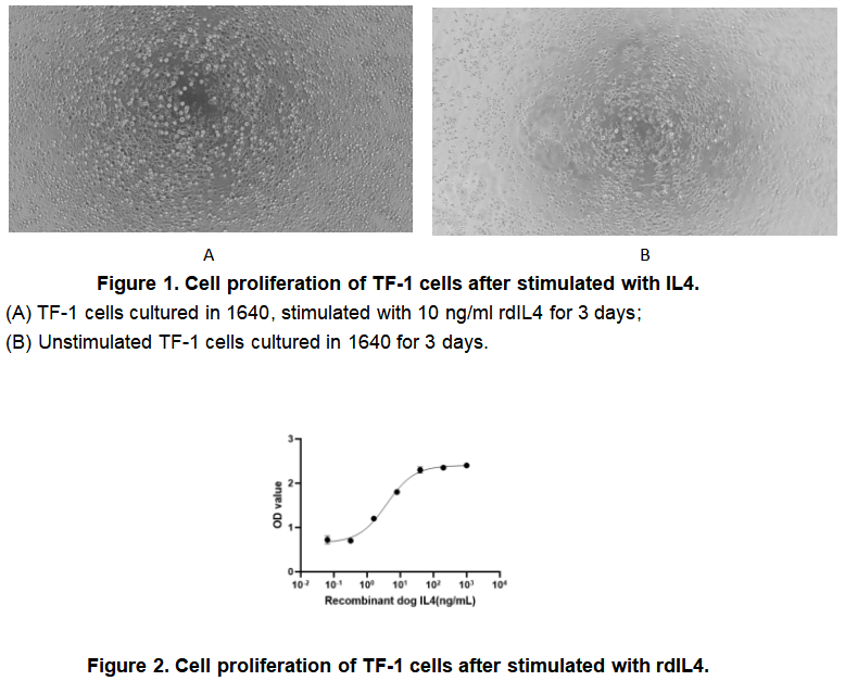 The interleukin 4 (IL4,) is a cytokine that induces differentiation of naive helper T cells (Th0 cells) to Th2 cells. Upon activation by IL4, Th2 cells subsequently produce additional IL4 in a positive feedback loop. IL4 has many biological roles, including the stimulation of activated B-cell and T-cell proliferation, and the differentiation of B cells into plasma cells. It is a key regulator in humoral and adaptive immunity. IL4 induces B-cell class switching to IgE, and up-regulates MHC class II production. IL4 decreases the production of Th1 cells, macrophages, IFN-gamma, and dendritic cell IL12. The activity of IL4 is usually measured by a cell proliferation assay using TF-1 cells. TF-1 cells were seeded into triplicate wells of 96-well plates at a density of 20000 cells/well with 10% serum standard 1640 which contains various concentrations of recombinant human IL4. After incubated for 3 days, cells were observed by inverted microscope and cell proliferation was measured by Cell Counting Kit-8 (CCK-8). Briefly, 10 µl of CCK-8 solution was added to each well of the plate, then the absorbance at 450 nm was measured using a microplate reader after incubating the plate for 2-4 hours at 37 ℃. Proliferation of TF-1 cells after incubation with IL4 for 3 days observed by inverted microscope was shown in Figure 1. Cell viability was assessed by CCK-8 (Cell Counting Kit-8 ) assay after incubation with rhIL4 for 3 days. The result was shown in Figure 2. It was obvious that rhIL4 significantly increased cell viability of TF-1 cells. The ED50 is 2.40 ng/ml.