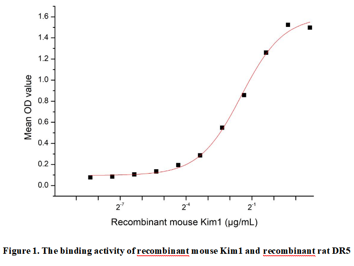 Kidney Injury Molecule 1, also known as Kim1 or TIM-1, is a transmembrane glycoprotein encoded by the HAVCR1 gene. It is minimally expressed in healthy kidneys but markedly upregulated following renal injury, making it a sensitive biomarker for acute kidney injury (AKI). Kim1 plays a dual role in kidney damage: it promotes phagocytosis of apoptotic cells and cellular debris, aiding tissue repair, while its persistent expression may contribute to fibrosis and chronic kidney disease (CKD). Structurally, Kim1 contains an immunoglobulin-like domain and a mucin-rich extracellular region. Beyond AKI, Kim1 is implicated in immune regulation and viral entry . Its diagnostic and therapeutic potential is actively researched.Besides,Death receptor 5 (DR5) has been identified as an interactor of Kim1, thus a functional binding ELISA assay was conducted to detect the interaction of recombinant mouse Kim1 and recombinant rat DR5. Briefly, Kim1 was diluted serially in PBS with 0.01% BSA (pH 7.4). Duplicate samples of 100 μl were then transferred to DR5-coated microtiter wells and incubated for 1h at 37℃. Wells were washed with PBST and incubated for 1h with anti-Kim1 pAb, then aspirated and washed 3 times. After incubation with HRP labelled secondary antibody for 1h at 37℃, wells were aspirated and washed 5 times. With the addition of substrate solution, wells were incubated 15-25 minutes at 37℃. Finally, add 50 µL stop solution to the wells and read at 450/630nm immediately. The binding activity of recombinant mouse Kim1 and recombinant rat DR5 was shown in Figure 1, the EC50 for this effect is 0.36 µg/mL.