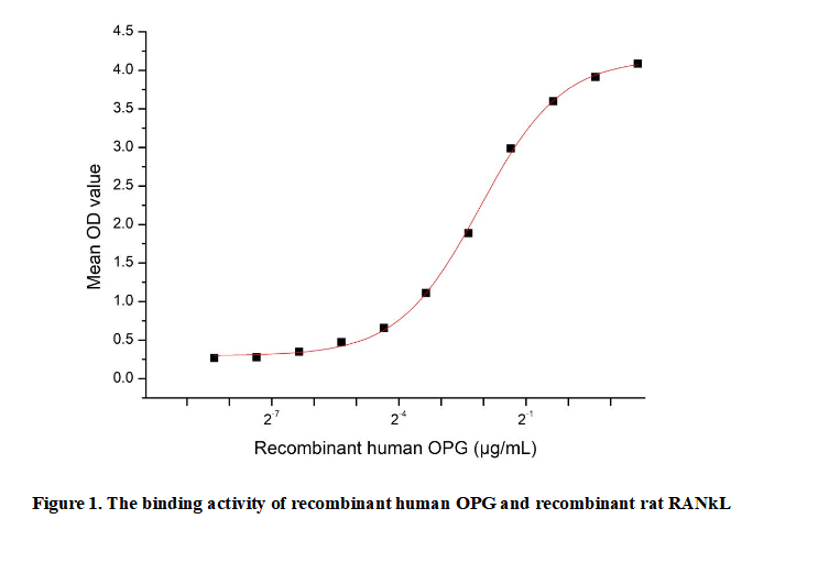 Osteoprotegerin (OPG), a secreted glycoprotein belonging to the tumor necrosis factor (TNF) receptor superfamily, is a crucial decoy receptor involved in the regulation of bone metabolism. It is primarily produced by osteoblasts and functions as a key inhibitor of osteoclastogenesis—the formation of bone-resorbing osteoclasts. By binding to its natural ligand, RANKL, OPG prevents RANKL from interacting with its functional receptor, RANK, on osteoclast precursors. This inhibition effectively blocks the signaling pathway essential for osteoclast differentiation and activation, thereby protecting bone from excessive resorption and maintaining skeletal integrity. OPG's role extends beyond bone, implicating it in vascular and immune biology.To detect the activity of recombinant OPG , a functional ELISA assay was performed to evaluate the interaction between recombinant human OPG and recombinant rat RANkL.Briefly, OPG was diluted serially in PBS with 0.01% BSA (pH 7.4). Duplicate samples of 100 μl were then transferred to RANkL-coated microtiter wells and incubated for 1h at 37℃. Wells were washed with PBST and incubated for 1h with anti-OPG pAb, then aspirated and washed 3 times. After incubation with HRP labelled secondary antibody for 1h at 37℃, wells were aspirated and washed 5 times. With the addition of substrate solution, wells were incubated 15-25 minutes at 37℃. Finally, add 50 µL stop solution to the wells and read at 450/630nm immediately. The binding activity of recombinant human OPG and recombinant rat RANkL was shown in Figure 1, the EC50 for this effect is 0.24µg/mL..