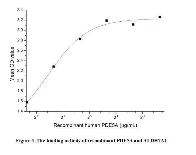 Phosphodiesterase 5A (PDE5A) is a key enzyme that regulates cellular signaling by hydrolyzing cyclic guanosine monophosphate (cGMP), a second messenger involved in smooth muscle relaxation and vasodilation. It is best known as the therapeutic target for sildenafil (Viagra) in treating erectile dysfunction and pulmonary arterial hypertension, where its inhibition increases cGMP levels to enhance blood flow. Research also explores its roles in cardiac function and cancer. Meanwhile, PDE5A can form a functional complex with ALDH7A1, an aldehyde dehydrogenase, potentially linking cGMP signaling to cellular metabolism and stress response pathways.Thus a functional ELISA assay was conducted to detect the interaction of recombinant PDE5A and recombinant ALDH7A1. Briefly, PDE5A was diluted serially in PBS with 0.01% BSA (pH 7.4). Duplicate samples of 100 μl were then transferred to ALDH7A1-coated microtiter wells and incubated for 1h at 37℃. Wells were washed with PBST and incubated for 1h with anti-PDE5A pAb, then aspirated and washed 3 times. After incubation with HRP labelled secondary antibody for 1h at 37℃, wells were aspirated and washed 5 times. With the addition of substrate solution, wells were incubated 15-25 minutes at 37℃. Finally, add 50 µL stop solution to the wells and read at 450/630nm immediately. The binding activity of recombinant PDE5A and recombinant ALDH7A1 was shown in Figure 1, the EC50 for this effect is 0.005µg/mL.