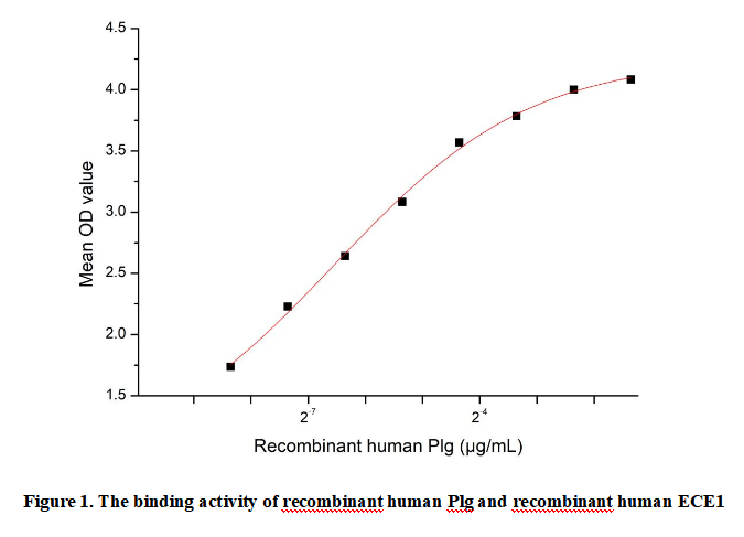 Plasminogen (Plg) is a glycoprotein predominantly synthesized in the liver and circulates in plasma as the zymogen (inactive precursor) of plasmin. It serves as a central mediator in fibrinolysis, extracellular matrix (ECM) degradation, and tissue remodeling processes. Upon activation by tPA or uPA, Plg is converted into plasmin—a broad-spectrum serine protease that participates in thrombolysis, cell migration, and inflammatory responses. Notably, emerging evidence suggests that Plg interacts with ECE1; this interaction may modulate Plg’s activation or spatial localization in vascular environments and inflammatory contexts.To detect the activity of recombinant Plg, a functional ELISA assay was performed to evaluate the interaction between recombinant human Plg and recombinant human ECE1. Briefly, biotin-linked Plg were diluted serially in PBS, with 0.01% BSA (pH 7.4). Duplicate samples of 100µl were then transferred to ECE1-coated microtiter wells and incubated for 1h at 37℃. Wells were washed with PBST 3 times and incubation with Streptavidin-HRP for 30min, then wells were aspirated and washed 5 times. With the addition of substrate solution, wells were incubated 15-25 minutes at 37℃. Finally, add 50µl stop solution to the wells and read at 450nm immediately. The binding activity of Plg and ECE1 was shown in Figure 1, the EC50 for this effect is 0.01µg/mL.