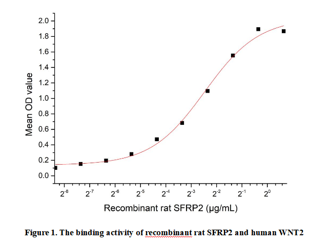 Secreted Frizzled Related Protein 2 (SFRP2) is a key modulator of the Wnt signaling pathway. It harbors a frizzled-like cysteine-rich domain (CRD) that shares homology with the Wnt-binding region of Frizzled receptors, and a C-terminal netrin domain. As a core member of the SFRP family, SFRP2 localizes in the extracellular space and exerts dual regulatory effects on Wnt signaling: it acts as an antagonist of canonical Wnt signaling while activating the noncanonical Wnt/Ca²⁺ pathway, participating in embryonic development, angiogenesis, tissue regeneration and tumorigenesis. It is widely expressed in the alimentary system, brain, embryo mesenchyme and other tissues, and its abnormal expression is associated with cardiovascular diseases and various cancers. SFRP2 binds directly to WNT2 via its CRD domain, blocking WNT2's interaction with Frizzled receptors to inhibit canonical Wnt signaling.Thus a functional ELISA assay was conducted to detect the interaction of recombinant rat SFRP2 and recombinant human WNT2. Briefly, SFRP2 was diluted serially in PBS with 0.01% BSA (pH 7.4). Duplicate samples of 100 μl were then transferred to WNT2-coated microtiter wells and incubated for 1h at 37℃. Wells were washed with PBST and incubated for 1h with anti-SFRP2 pAb, then aspirated and washed 3 times. After incubation with HRP labelled secondary antibody for 1h at 37℃, wells were aspirated and washed 5 times. With the addition of substrate solution, wells were incubated 15-25 minutes at 37℃. Finally, add 50 µl stop solution to the wells and read at 450/630nm immediately. The binding activity of recombinant rat SFRP2 and recombinant human WNT2 was shown in Figure 1, the EC50 for this effect is 0.181 µg/ml.