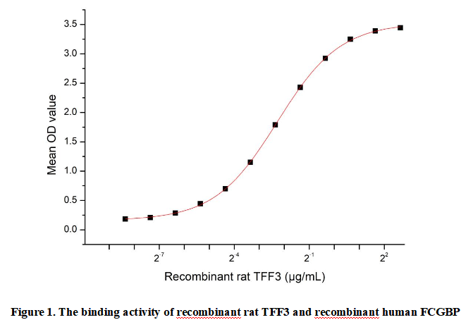 Trefoil Factor 3 (TFF3) is a small secretory protein primarily produced by gastrointestinal goblet cells, belonging to the trefoil factor family (TFF) characterized by a conserved trefoil domain. It plays crucial roles in mucosal protection, epithelial repair, and inflammation regulation by resisting protease degradation and promoting cell migration. TFF3 is highly expressed in the intestines and colon, where it stabilizes the mucus layer and facilitates wound healing. Additionally, TFF3 directly binds to FCGBP to form a heteromeric complex that enhances mucosal stability and repair.To detect the activity of recombinant TFF3, a functional ELISA assay was performed to evaluate the interaction between recombinant rat TFF3 and recombinant human FCGBP.Briefly, biotin-linked TFF3 were diluted serially in PBS, with 0.01% BSA (pH 7.4). Duplicate samples of 100µl were then transferred to FCGBP-coated microtiter wells and incubated for 1h at 37℃. Wells were washed with PBST 3 times and incubation with Streptavidin-HRP for 30min, then wells were aspirated and washed 5 times. With the addition of substrate solution, wells were incubated 15-25 minutes at 37℃. Finally, add 50µl stop solution to the wells and read at 450nm immediately. The binding activity of TFF3 and FCGBP was shown in Figure 1, the EC50 for this effect is 0.21µg/mL..