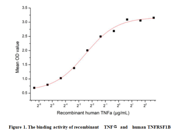 Tumor Necrosis Factor Alpha (TNFα, designated A133Hu) is a pivotal pro-inflammatory cytokine involved in immune regulation and host defense. Discovered for its ability to induce tumor cell necrosis, it is primarily secreted by activated macrophages and T lymphocytes. TNFα mediates diverse biological processes, including inflammation, cell proliferation, differentiation, and apoptosis, by binding to specific cell surface receptors. Dysregulated TNFα expression is linked to numerous inflammatory and autoimmune diseases, such as rheumatoid arthritis and Crohn’s disease, making it a key therapeutic target. TNFα (A133Hu) binds directly to mouse-derived TNFRSF1B (B504Mu), initiating downstream signaling pathways that modulate immune and inflammatory responses.Thus a functional ELISA assay was conducted to detect the interaction of recombinant human TNFα and recombinant human TNFRSF1B. Briefly, TNFα was diluted serially in PBS with 0.01% BSA (pH 7.4). Duplicate samples of 100 μl were then transferred to TNFRSF1B-coated microtiter wells and incubated for 1h at 37℃. Wells were washed with PBST and incubated for 1h with anti- TNFα pAb, then aspirated and washed 3 times. After incubation with HRP labelled secondary antibody for 1h at 37℃, wells were aspirated and washed 5 times. With the addition of substrate solution, wells were incubated 15-25 minutes at 37℃. Finally, add 50 µL stop solution to the wells and read at 450/630nm immediately. The binding activity of recombinant rat TNFα and recombinant human TNFRSF1B was shown in Figure 1, the EC50 for this effect is 0.17655µg/mL.