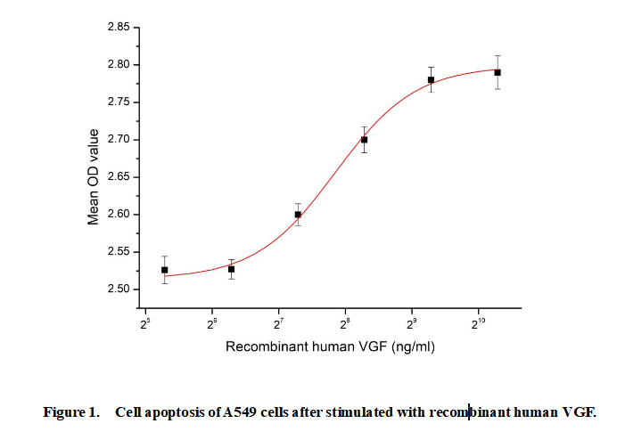 VGF (nerve growth factor inducible) is a secretory polypeptide precursor belonging to the granin/secretogranin family, selectively expressed in neuronal and neuroendocrine cells. It promotes cell proliferation, survival, and migration, while inhibiting apoptosis in neurons and multiple cancer cell types. VGF drives oncogenic signaling, enhances therapy resistance, and facilitates epithelial–mesenchymal transition. Its proteolytic products mediate neurogenesis, energy homeostasis, and tumor progression, positioning VGF as a key regulator in neural function and cancer pathogenesis.To test the effect of VGF on cell apoptosis, A549 cells were seeded into triplicate wells of 96-well plates and allowed to attach, replaced with various concentrations of recombinant human VGF. After incubated for 48 hours, cells were observed by inverted microscope and cell proliferation was measured by Cell Counting Kit-8 (CCK-8). Briefly, 10 µl of CCK-8 solution was added to each well of the plate, then the absorbance at 450 nm was measured using a microplate reader after incubating the plate for 1-4 hours at 37 ℃. Cell viability was assessed by CCK-8 (Cell Counting Kit-8 ) assay after incubation with recombinant human VGF for 48 hours. The result was shown in Figure 1. It was obvious that VGF significantly decreased cell viability of A549 cells.The ED50 of recombinant human VGF is 230 ng/mL.