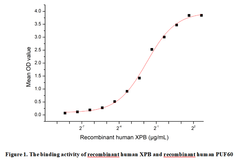 Xeroderma Pigmentosum, Complementation Group B (XPB) is a crucial DNA helicase encoded by the ERCC3 gene in humans. As a component of the transcription factor IIH (TFIIH) complex, XPB plays dual roles in nucleotide excision repair (NER) and transcription initiation. In NER, it unwinds DNA around lesion sites to facilitate damage removal, while in transcription, it helps open promoter regions for RNA polymerase II. Besides,Poly U Binding Splicing Factor 60kDa (PUF60) has been identified as an interactor of XPB, thus a functional binding ELISA assay was conducted to detect the interaction of recombinant human XPB and recombinant human PUF60 .Briefly, biotin-linked XPB were diluted serially in PBS, with 0.01% BSA (pH 7.4). Duplicate samples of 100μl were then transferred to PUF60-coated microtiter wells and incubated for 1h at 37℃. Wells were washed with PBST 3 times and incubation with Streptavidin-HRP for 30min, then wells were aspirated and washed 5 times. With the addition of substrate solution, wells were incubated 15-25 minutes at 37℃. Finally, add 50µl stop solution to the wells and read at 450nm immediately. The binding activity of recombinant human XPB and recombinant human PUF60 was shown in Figure 1, the EC50 for this effect is 0.29 µg/mL.