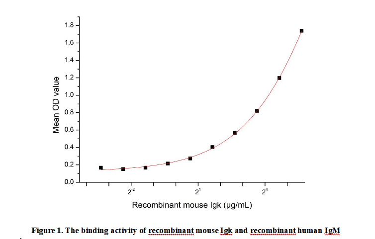 Immunoglobulin Kappa (Igk) is a type of light chain found in antibodies, which are critical components of the adaptive immune system . It associates with immunoglobulin heavy chains to constitute complete, functional antibody molecules, including but not limited to IgG and IgM classes. This pairing is essential for the structural integrity and antigen-binding capability of these immunoglobulins. In humans, the IGK gene located on chromosome 2 encodes this essential protein, which represents one of the two major light chain types - either kappa or lambda. The production of Igk chains is subject to stringent regulatory mechanisms to guarantee correct antibody formation. Impairments in Igk function may result in various immunological disorders, including immunodeficiency states and B-cell derived cancers. Clinically, kappa light chains have significant diagnostic value as biomarkers for detecting monoclonal gammopathies, particularly multiple myeloma.To detect the activity of recombinant Igk, a functional ELISA assay was performed to evaluate the interaction between recombinant mouse Igk and recombinant human IgM.Briefly, Igk was diluted serially in PBS with 0.01% BSA (pH 7.4). Duplicate samples of 100 μl were then transferred to IgM-coated microtiter wells and incubated for 1h at 37℃. Wells were washed with PBST and incubated for 1h with anti-Igk pAb, then aspirated and washed 3 times. After incubation with HRP labelled secondary antibody for 1h at 37℃, wells were aspirated and washed 5 times. With the addition of substrate solution, wells were incubated 15-25 minutes at 37℃. Finally, add 50 µL stop solution to the wells and read at 450/630nm immediately. The binding activity of recombinant mouse Igk and recombinant human IgM was shown in Figure 1, and this effect was in a dose dependent manner.